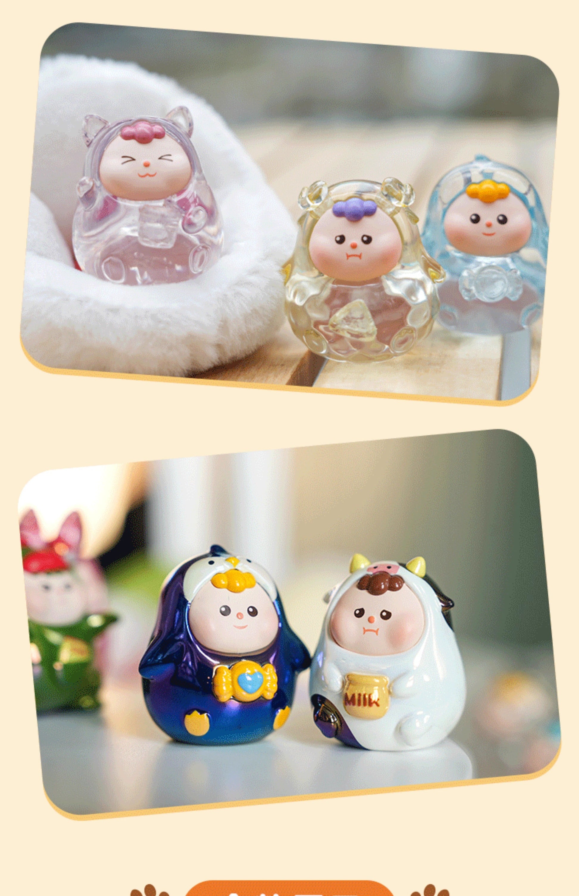 3. Please note that blind boxes may have manufacturing defects such as uneven dyeing, minor scratches, paint loss, or air bubbles. These imperfections are a normal part of the production process, and we appreciate your understanding.